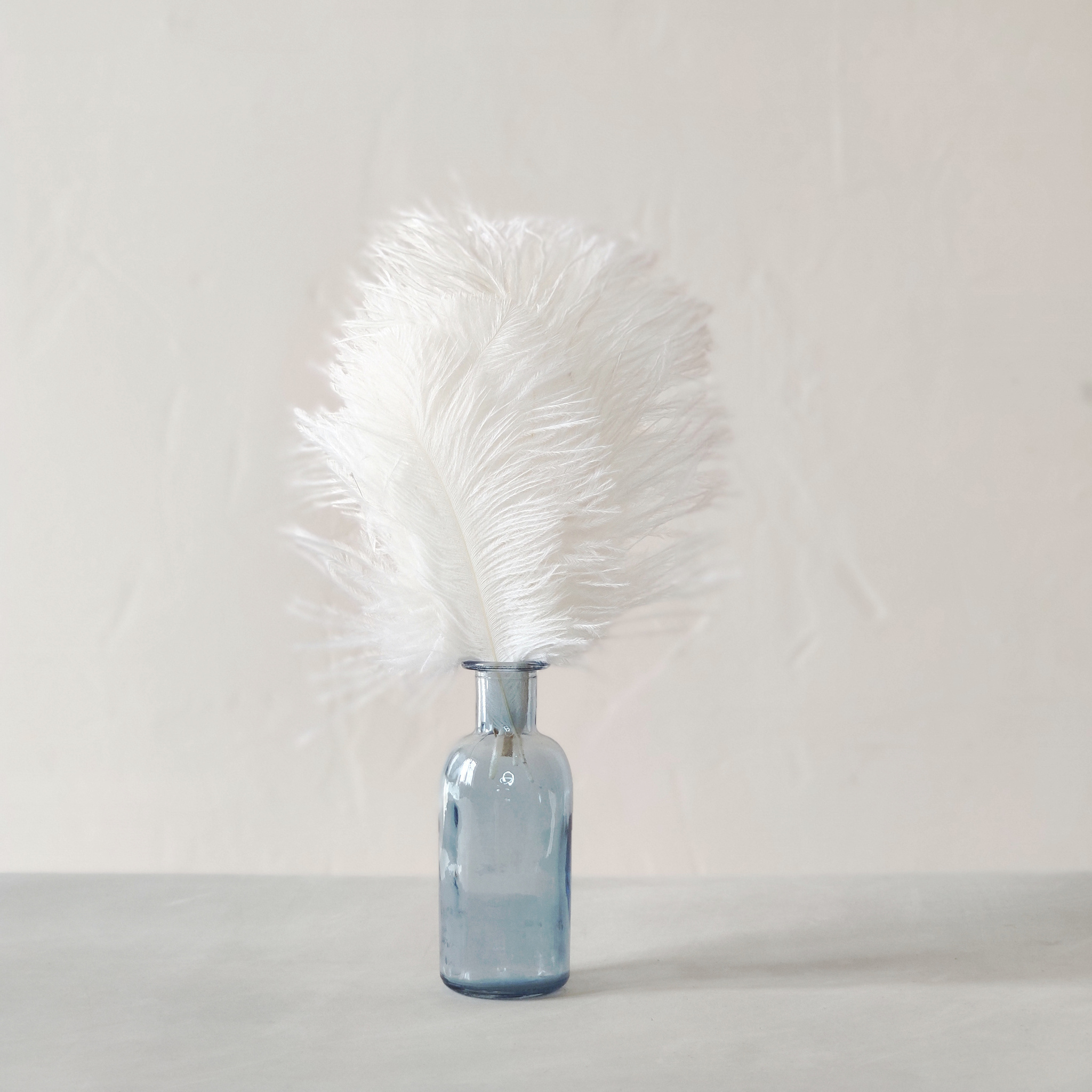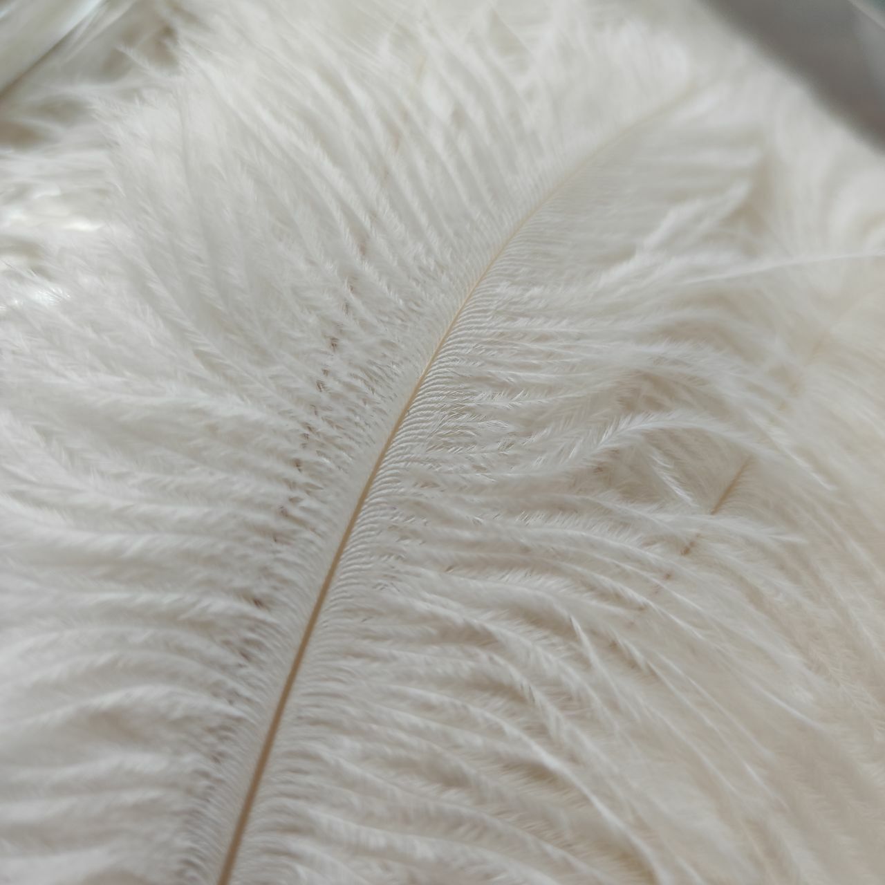 Натуральные белые страусиные перья. Цвет молочно-белый. Очень мягкие и пушистые. Имеют плавную овальную форму. Если перо поставить вертикально, кончик слегка наклоняется, но перо не падает, а только пригибается в одну из сторон.