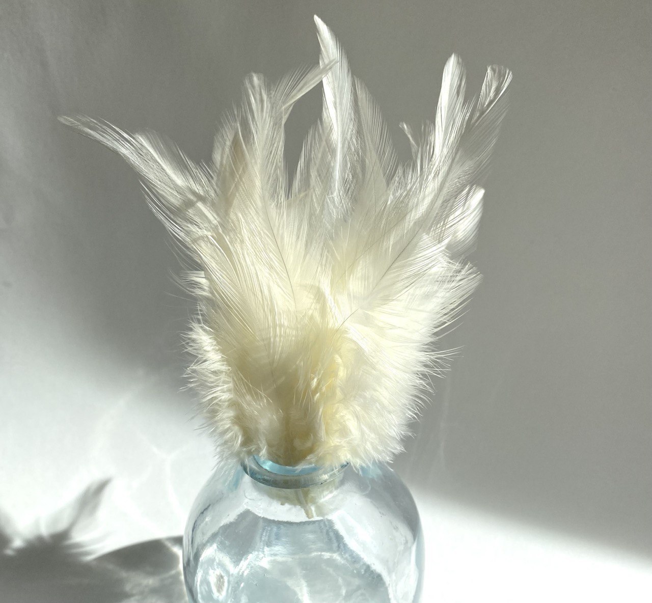 В упаковке 20 перьев размером от 7 см. до 13 см. Чаще всего в одной упаковке лежат перья всех размеров. Пуховая часть у петушиных перьев большая и занимает примерно две трети длины пера. У самых больших перьев ширина может доходить до восьми см.